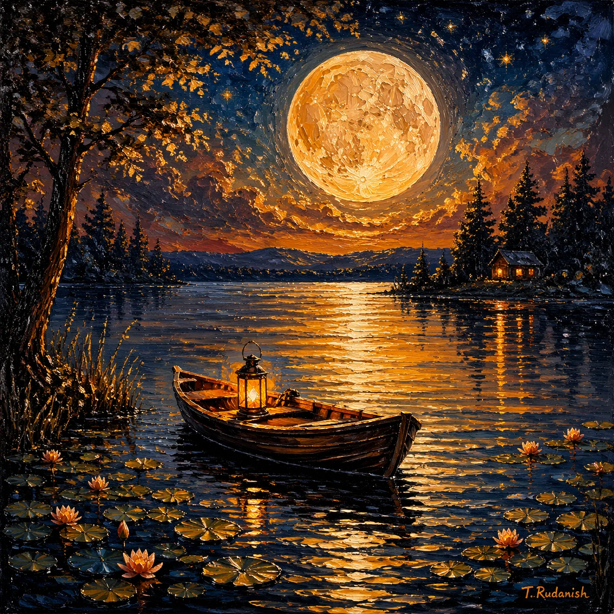 This is a vibrant oil painting by artist T. Rudanish depicting a serene lakeside scene at night. A large, luminous full moon dominates the sky, casting a golden glow over the rippling water below. A small wooden boat, adorned with a lantern, floats in the foreground, creating a reflective pathway of light on the lake's surface. Surrounding the water, dark, textured foliage frames the scene, with delicate lily pads scattered across the water's edge. The overall palette is rich with warm hues of gold, orange, and deep blue, evoking a tranquil, mystical ambiance.