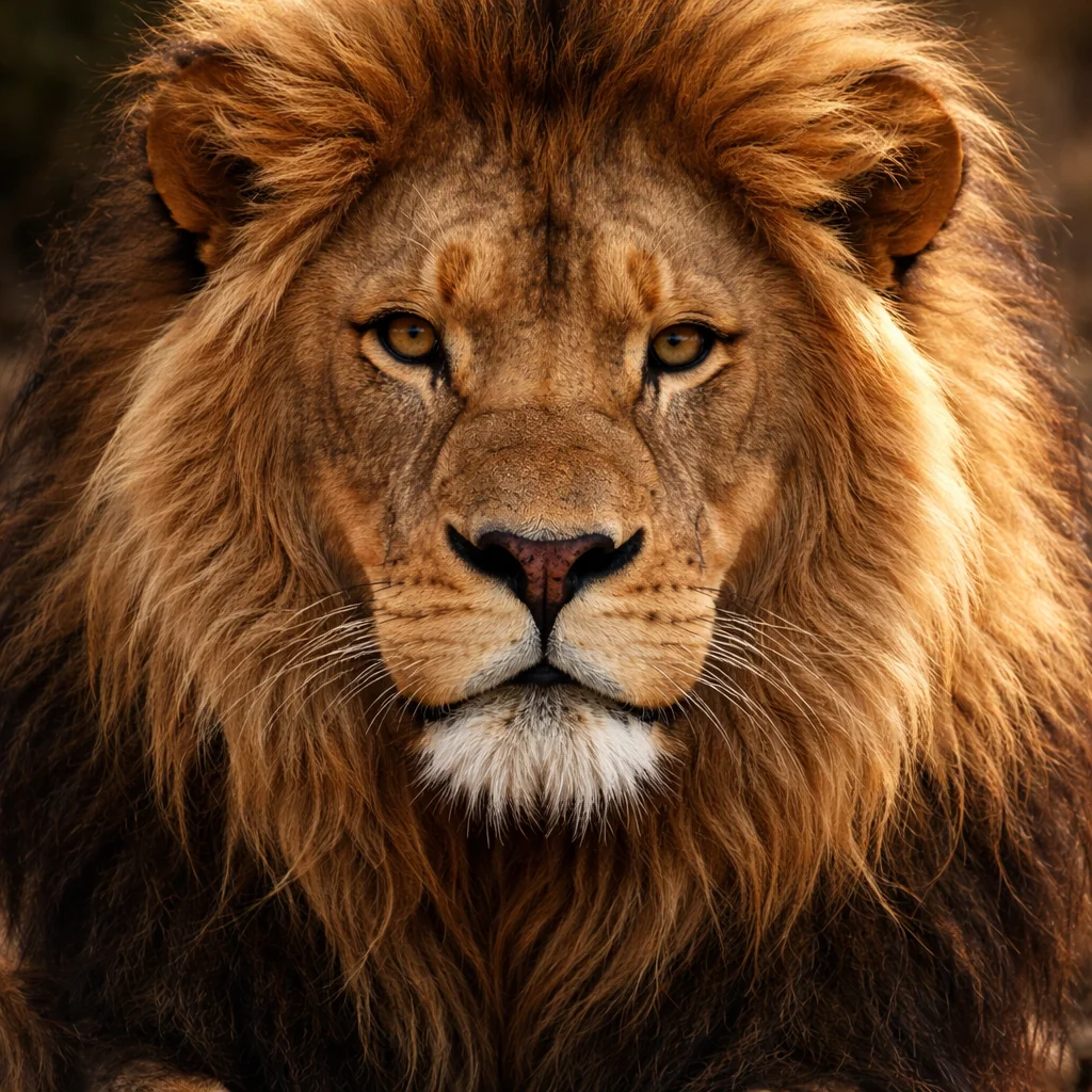 Close-up of a majestic male lion, golden mane, sharp eyes, professional wildlife photography