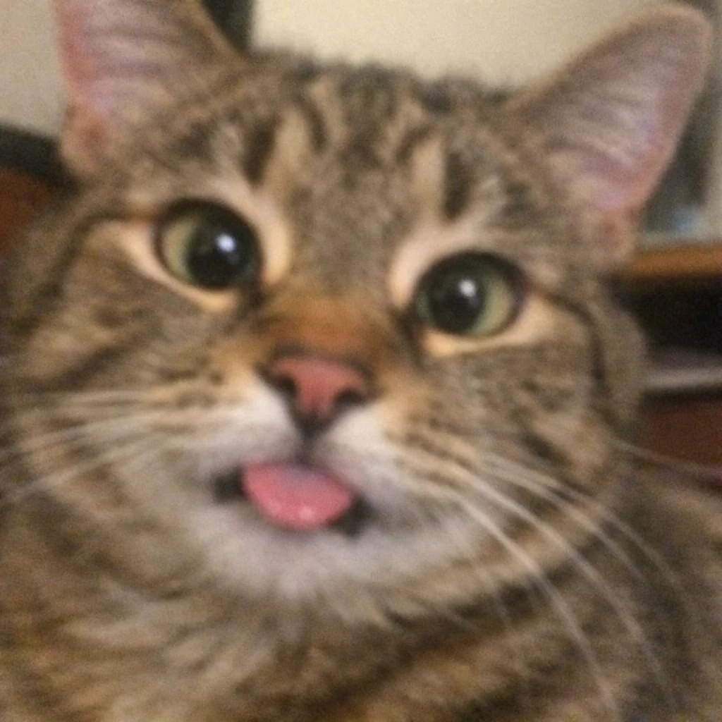 a low quality funny cat profile picture of a real, playful tabby cat making a silly but wholesome face, slightly derpy eyes and tongue peek, casual close-up shot with natural indoor lighting, slightly off-center framing, minor motion blur and camera noise from a real phone or DSLR, unpolished and candid look, soft and charming expression, low resolution, pixelated details, 1:1 aspect ratio.