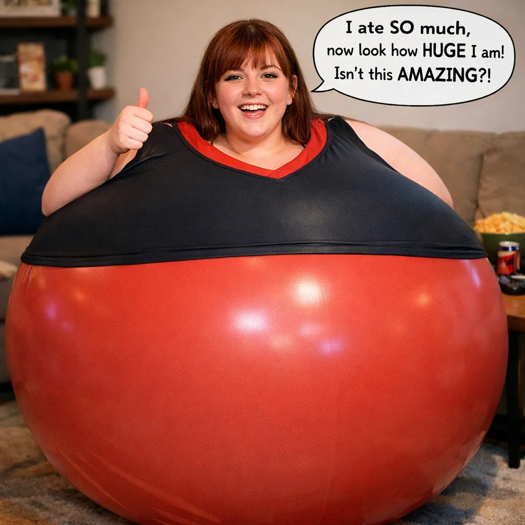 is inside a giant balloon with her head sticking out. Her clothes are stretched over the balloon, covering it. She's bragging about how much she ate to get this big.