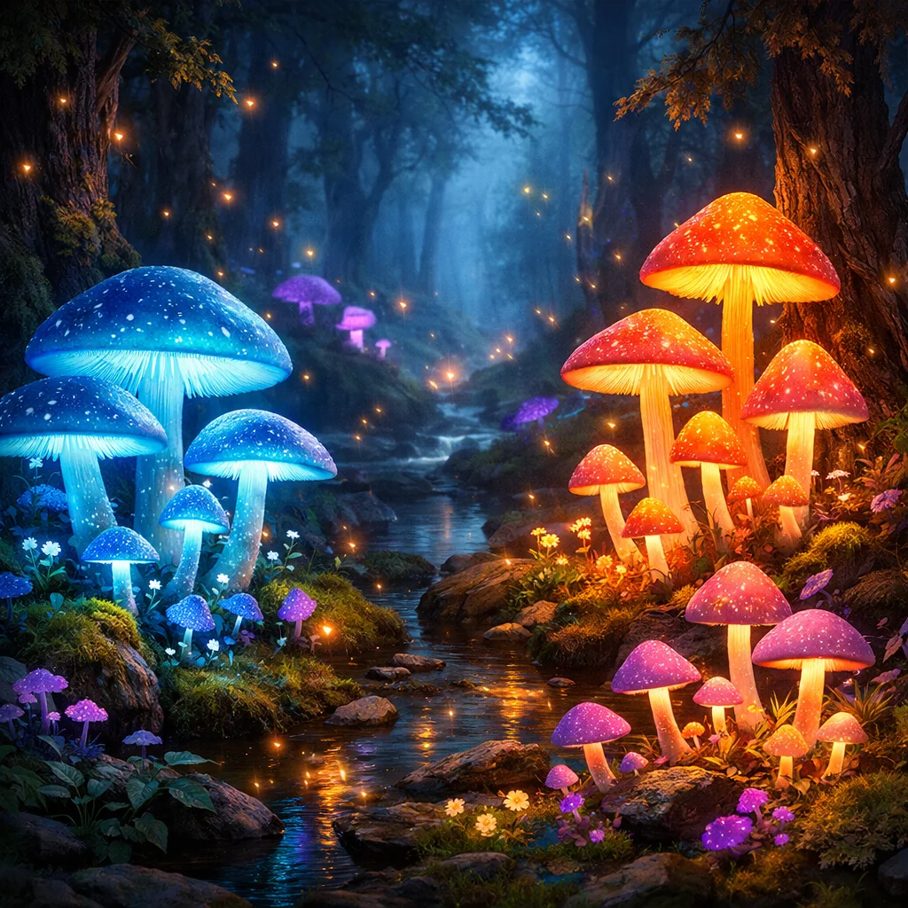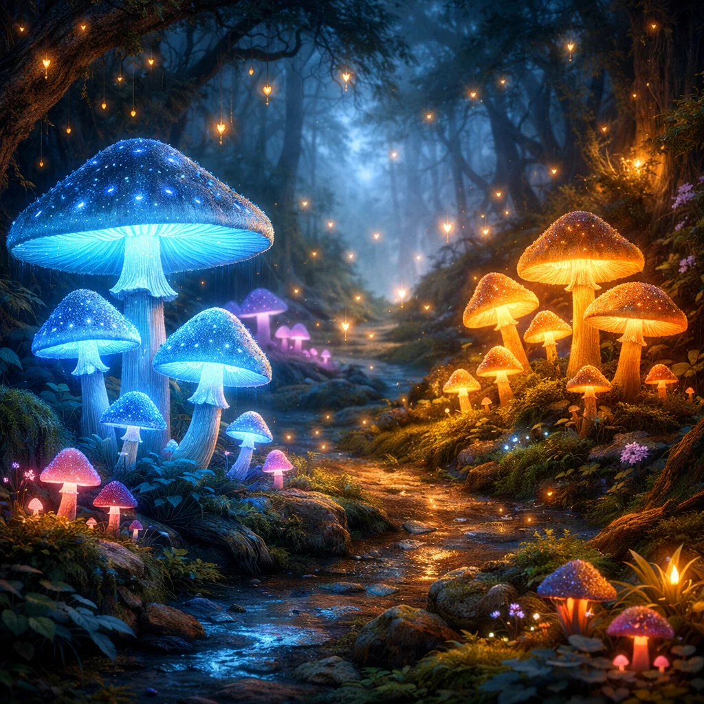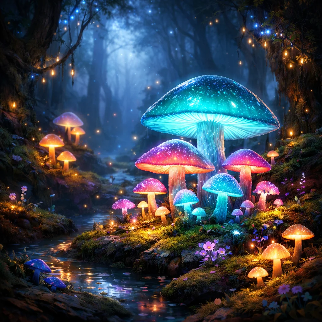 Glowing mushrooms in magical forest, fairytale atmosphere, mystical lighting, fantasy art style