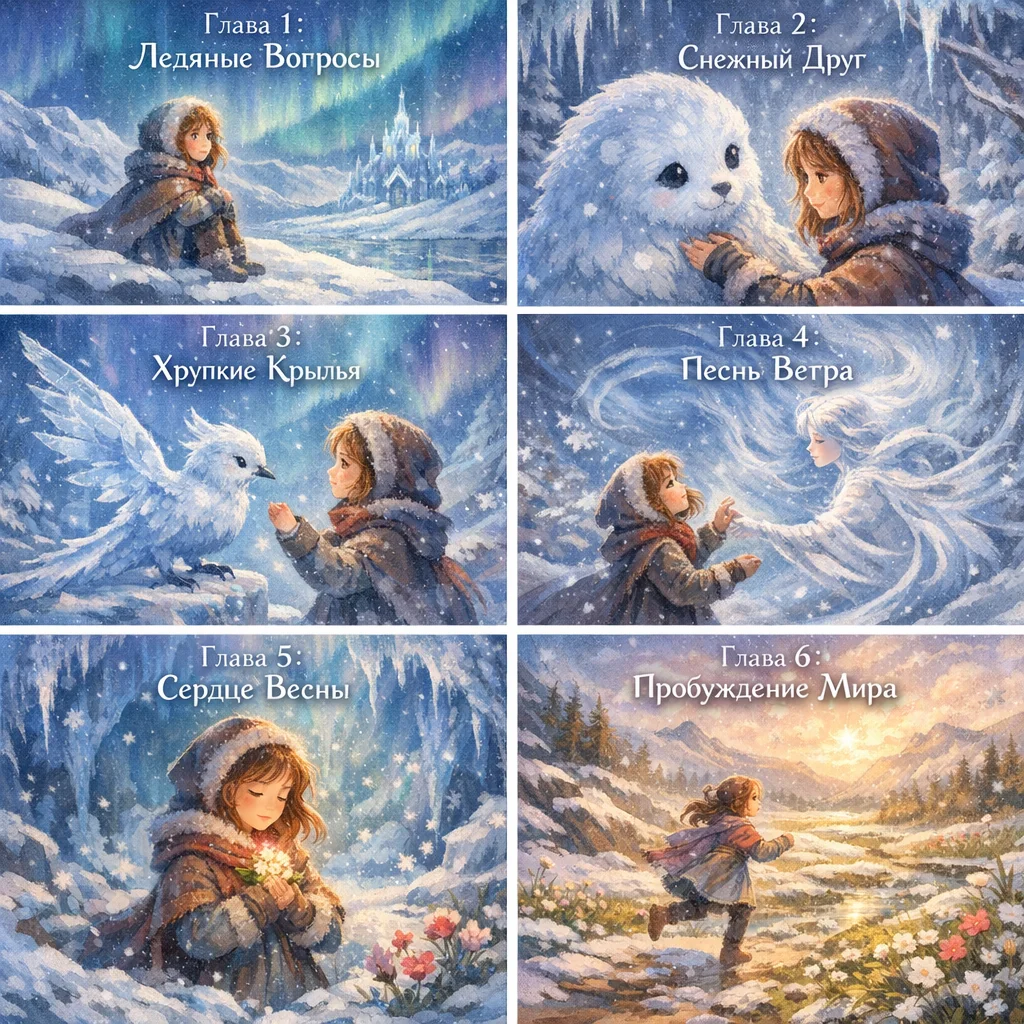 Создай авторскую волшебную сказку для детей (6–10 лет) с глубоким смыслом взросления, поиска себя и принятия перемен. Главная героиня: девочка по имени Ева (10-12 лет), чувствительная, мечтательная, немного одинокая, но с внутренним светом и любопытством к миру. Мир: фантазийный, визуально красивый, но холодный мир вечной зимы. Везде снег, ледяные узоры, морозные ветры, сияющие северные огни. Несмотря на красоту, этот мир ощущается пустым, тихим и немного грустным. Завязка: Ева чувствует, что ей не хватает тепла — не только физического, но и душевного. Она начинает задаваться вопросами: «Почему здесь всегда зима?», «Можно ли это изменить?», «Кто я в этом мире?» Сюжет: Ева отправляется в путешествие через зимний мир. На пути она проходит несколько символических испытаний (страх, одиночество, сомнения, необходимость довериться другим). Она встречает волшебных друзей (например: снежное существо, потерявшее тепло; ледяную птицу, которая боится летать; дух ветра, который не умеет останавливаться). Каждый персонаж отражает внутренние состояния самой Евы. Кульминация: Ева понимает, что зима — это не враг, а часть мира, но она не должна быть вечной. Через принятие себя, своих чувств и через дружбу она находит в себе "весну" — тепло, свет, жизнь. Финал: зима постепенно превращается в весну. Лед тает, появляются первые цветы, мир оживает. Ева становится увереннее, спокойнее и счастливее. Она понимает: перемены — это не страшно, а естественно и красиво. Смысл: сказка должна мягко показать ребёнку, что взросление — это путь, что чувства важны, что меняться можно и нужно, и что внутри каждого есть свет, который способен менять мир. Стиль текста: волшебный, поэтичный, тёплый, образный, с красивыми описаниями, но понятный детям. Дополнительно: разбей сказку на главы (5–7 небольших частей), каждая с мини-сюжетом и моралью. Визуальный стиль иллюстраций: рисованный реализм, мягкий свет, детализированные зимние пейзажи, сказочная атмосфера, нежные цвета, плавный переход от холодных голубых оттенков к тёплым весенним. Для каждой главы добавь описание сцены для иллюстрации (как промпт для генерации изображения).