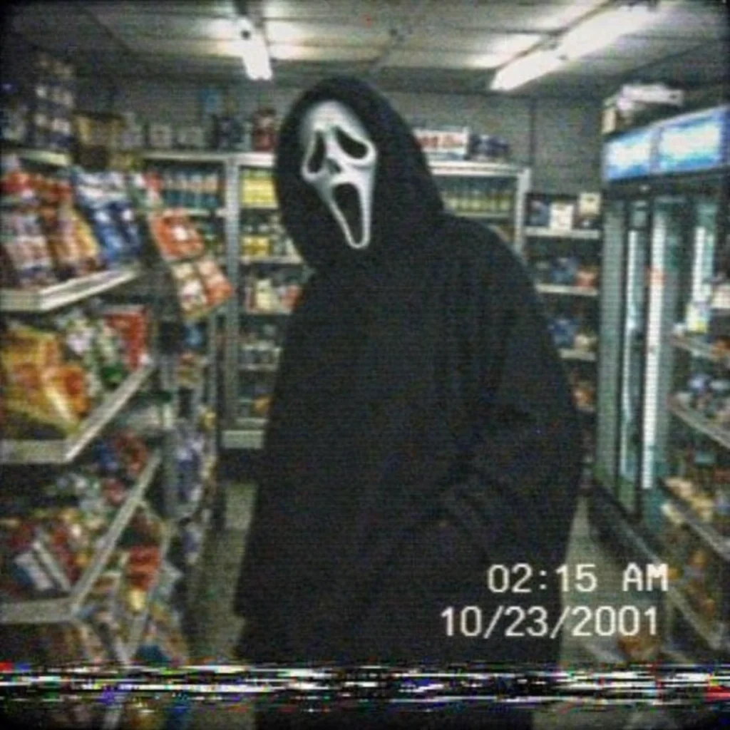Square 1:1 image, realistic low-quality retro analog CCTV ca...