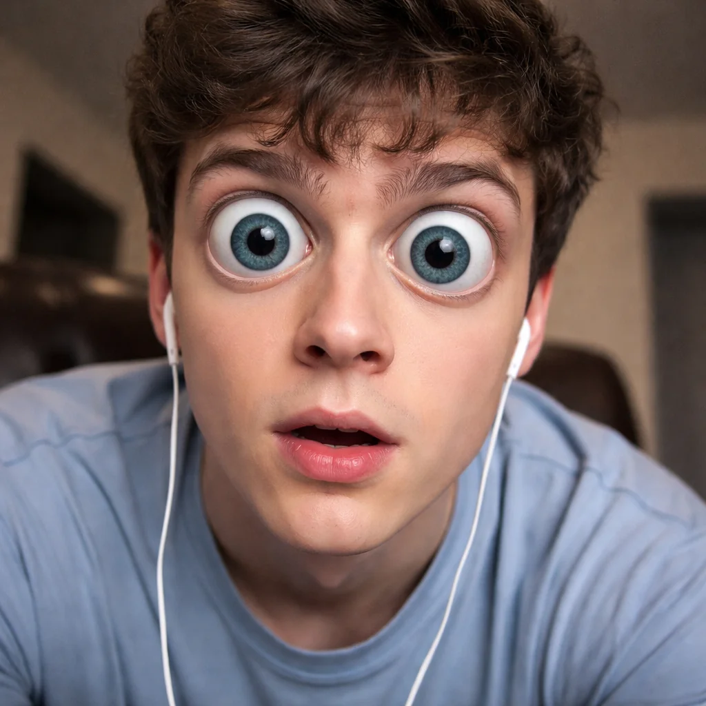 give my friend raffy large pale white indigo-blueish pale eyes that are huge staring at the screen kinda like how he is now, make the eyes look like that one guy from tiktok going “your not supposed to be back here” as the funny video of somebody trying to hypnotize