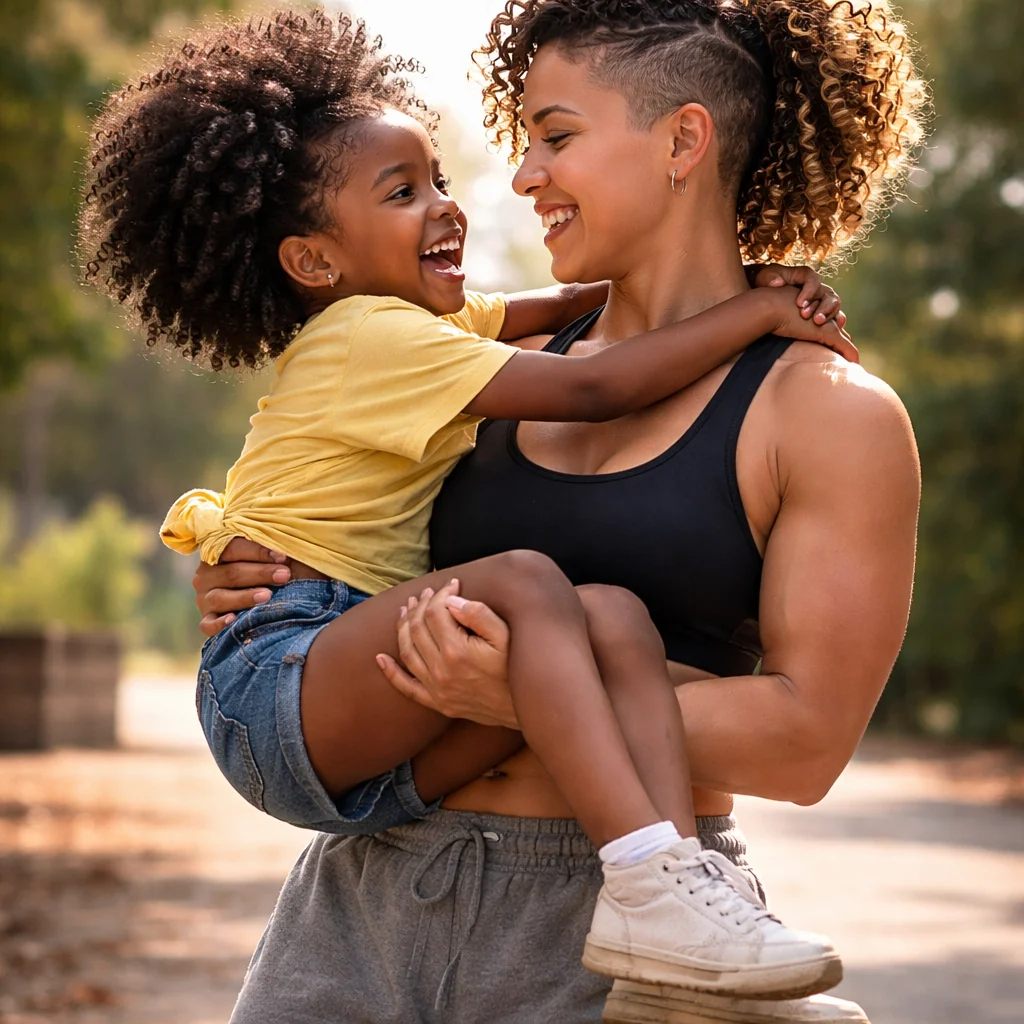 A black scrawny girl with poofy curly hair being carried by a masculine big light skin woman with curly undercut hair with a sports bra