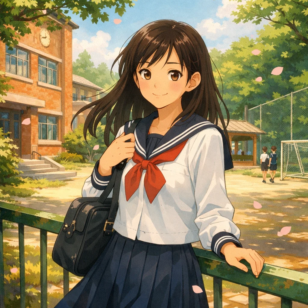 参考我给的图片,绘制吉卜力漫画风格穿着JK服装的高中少女写真,场景改为校园。