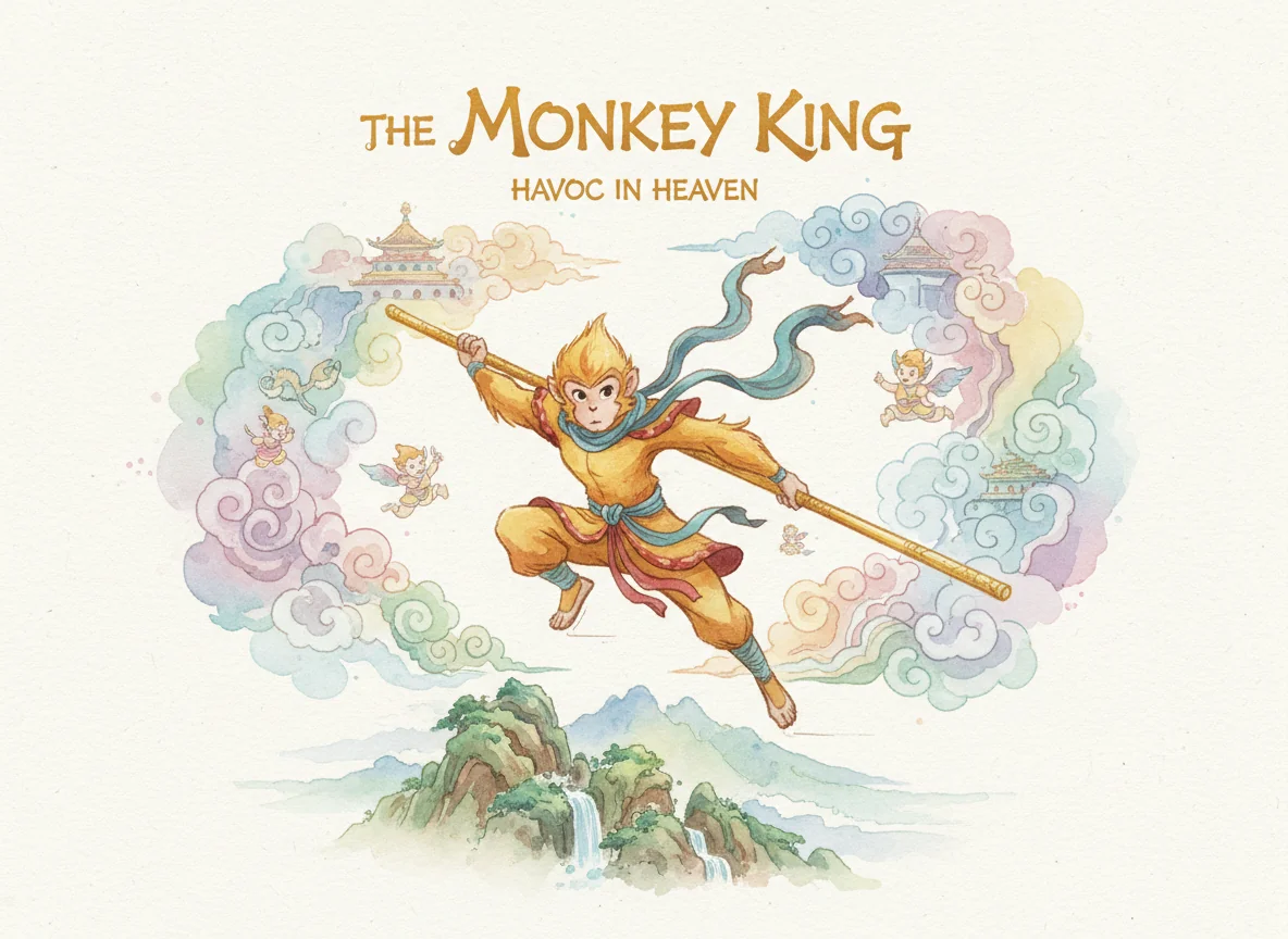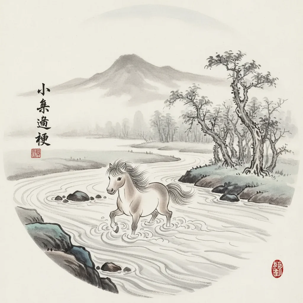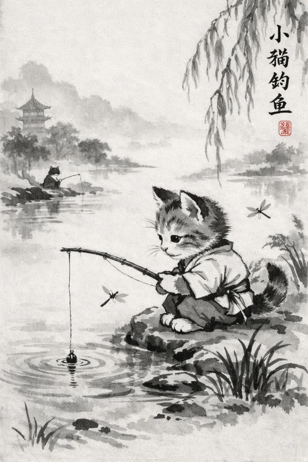 绘制童话故事:小猫钓鱼,采用水墨画风。