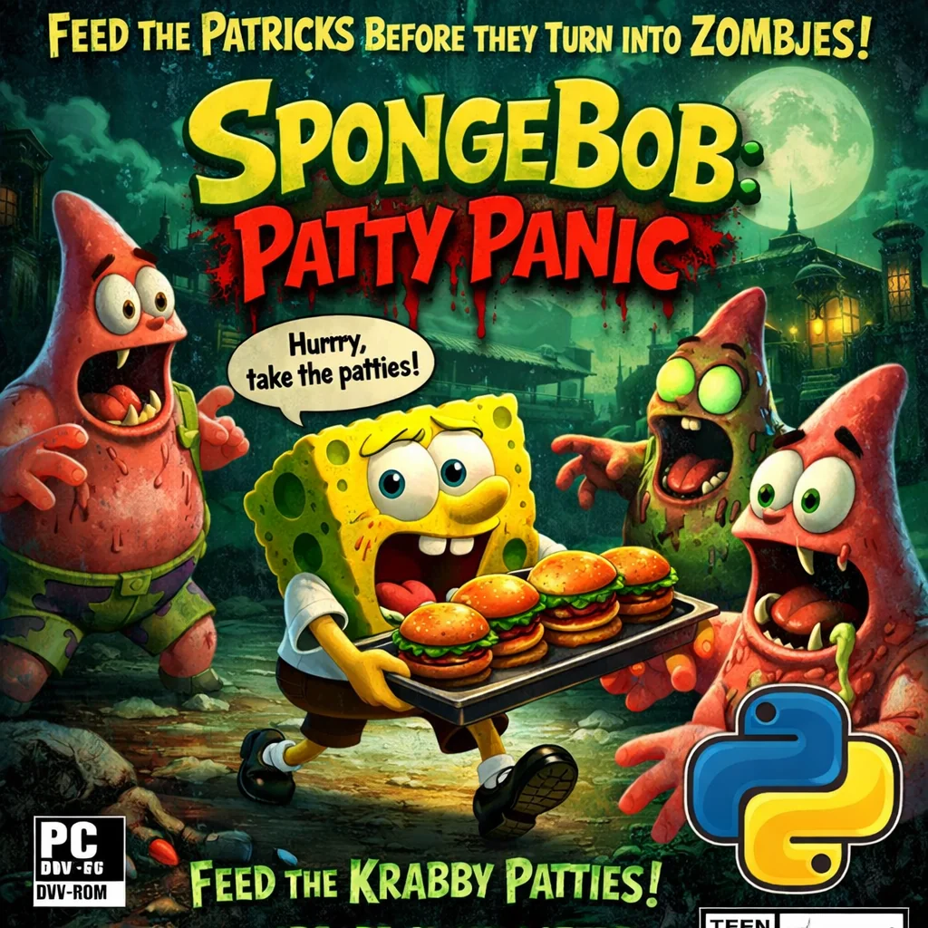 make a pc game cover about spongebob feeding the krabby patties to the patricks before they turn into zombies due to hunger with a python logo