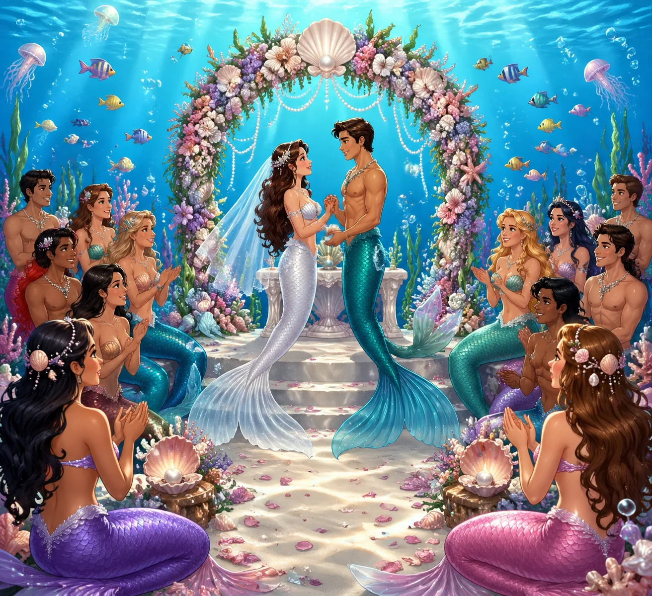 generate a clipart/animated photo of a wedding under the sea...