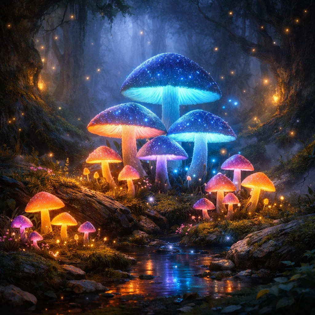 Glowing mushrooms in magical forest, fairytale atmosphere, mystical lighting, fantasy art style