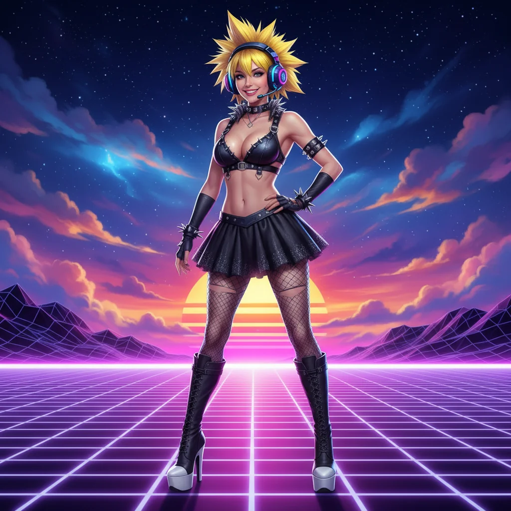 A tall slim punk woman with yellow hair, blue bangs and with big breasts, wearing leather bra, oversized futuristic neon black headset with microphone, bracelets with spikes, black long fingerless gloves. Her outfit is completed with a very short flouncy black mini skirt that shimmers with hints of silver, black stockings paired with tall futuristic dark leather high heel shoes with white toes and white soles. Set in a vibrant Retrowave-inspired atmosphere, with glowing grid lines and a cosmic sunset backdrop, this artwork features high-quality details and full-height character design, blending anime aesthetics with a touch of realism for a striking visual experience, she is smiling, feet at shoulder with apart, real proportions