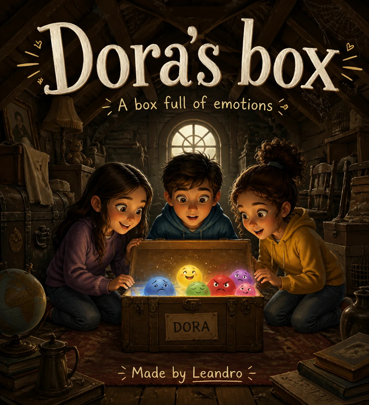 make me a cover page for my book called Dora's box with thre...