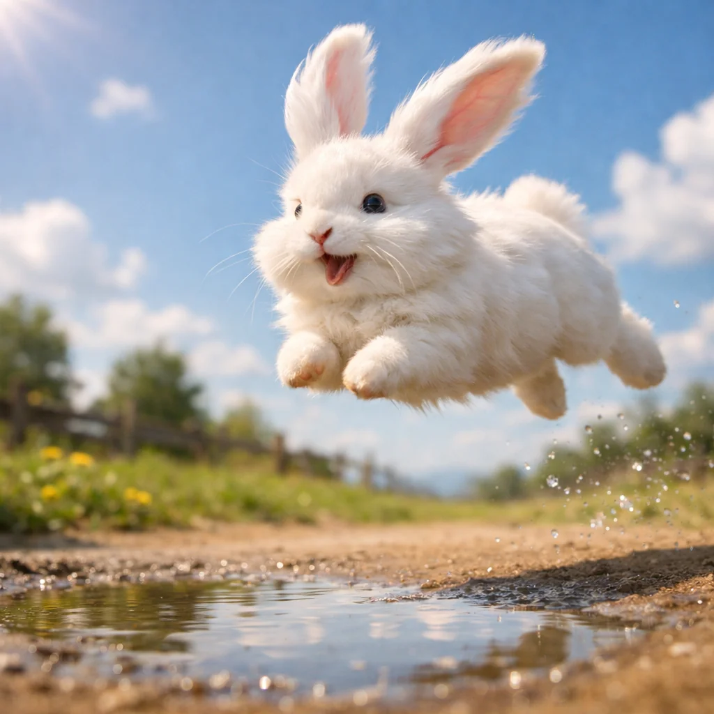 “the same fluffy bunny preparing then leaping into the air over the puddle, starting with small hops then a big jump, ears flopping upward in slow motion, joyful expression, camera slightly slow motion tracking the jump, bright sunny sky, cinematic movement, soft shadows, smooth animation