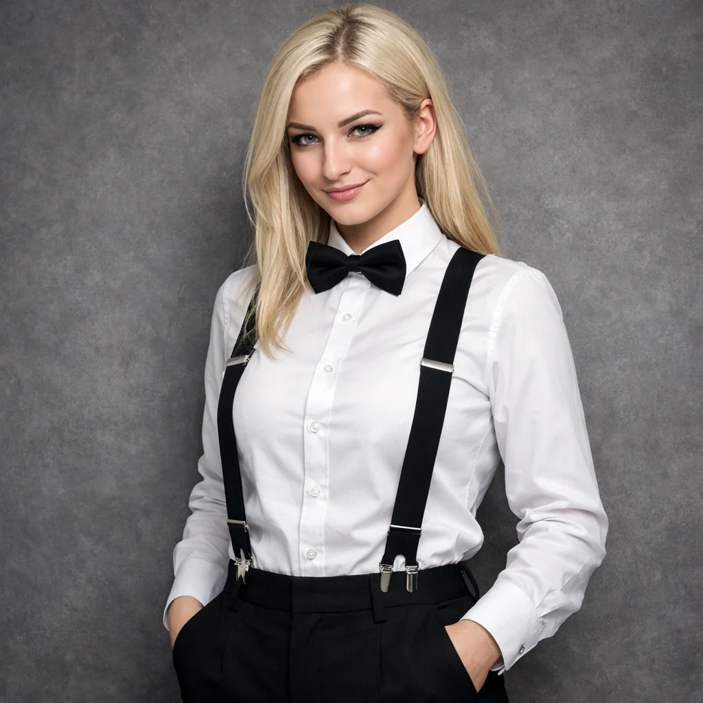 Have her smirking, change outfit to white long sleeve button up fully buttoned up, black bowtie, black suspenders and black pants