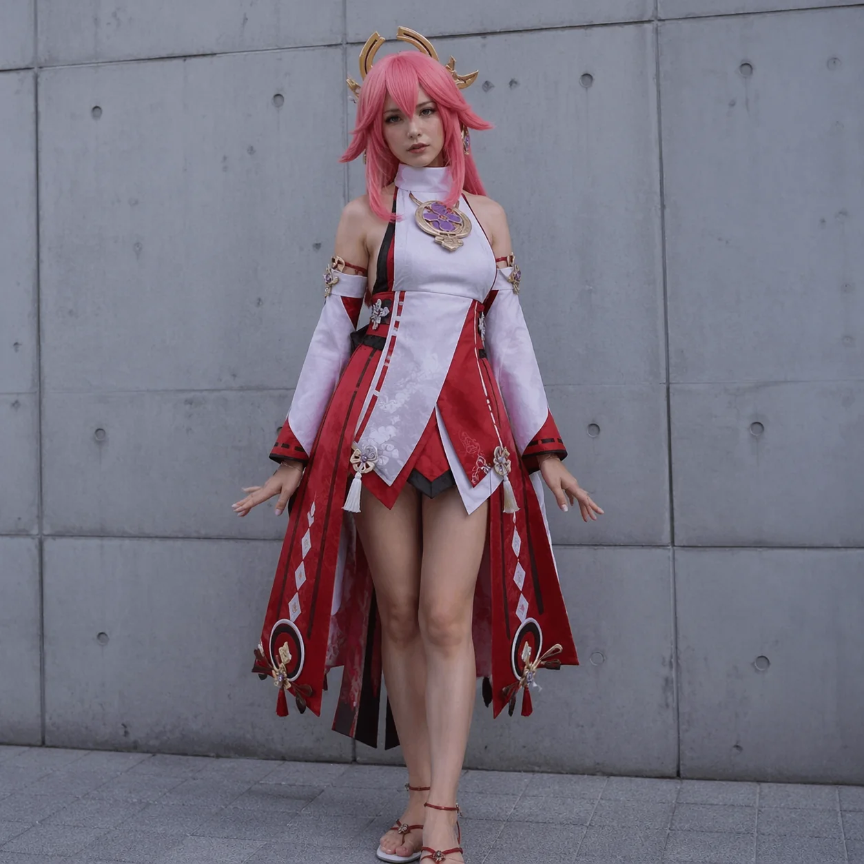 Transform into a hyper realistis look like a cosplayer. And full body visible knees