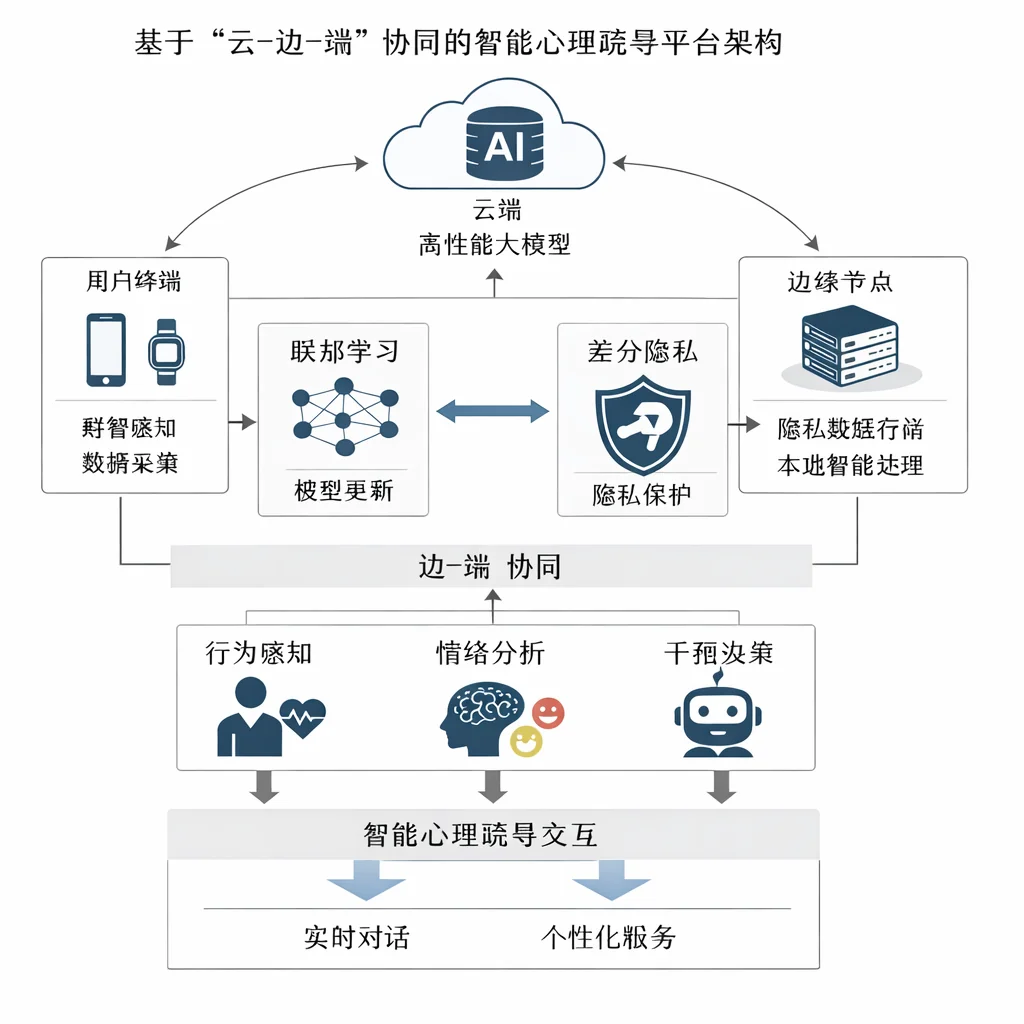 本项目旨在构建一个深度融合群智感知[1][2]数据收集机制、联邦学习与差分隐私技术,并基于“云-边-端”协同架构的智能心理疏导交互平台。系统采用移动群智感知模式,以众包[1]方式汇聚多源移动终端数据,支持环境感知与实时决策,同时引入差分隐私技术对用户位置等动态敏感信息进行有效保护。在架构设计上,系统依托“云-边-端”协同框架,结合边缘智能理念,通过智能体统一调度用户行为感知、情绪分析与干预决策等环节,形成持续的感知网络。用户隐私数据存储于边缘节点,由边缘设备执行实时、轻量级的本地交互任务,确保在网络受限环境下仍能提供基本服务能力。当面临复杂对话场景时,智能体可动态向云端发起协同请求,调用高性能大模型进行深度语义理解与生成,实现服务能力与隐私保护的有效平衡。最终建成一个具备智能体协同感知、边缘智能、隐私保护与个性化服务能力的心理疏导平台。根据上面这段话生成一个科研论文里的流程图,要求风格简洁严谨,使用箭头或图形,文字采用简体中文宋体