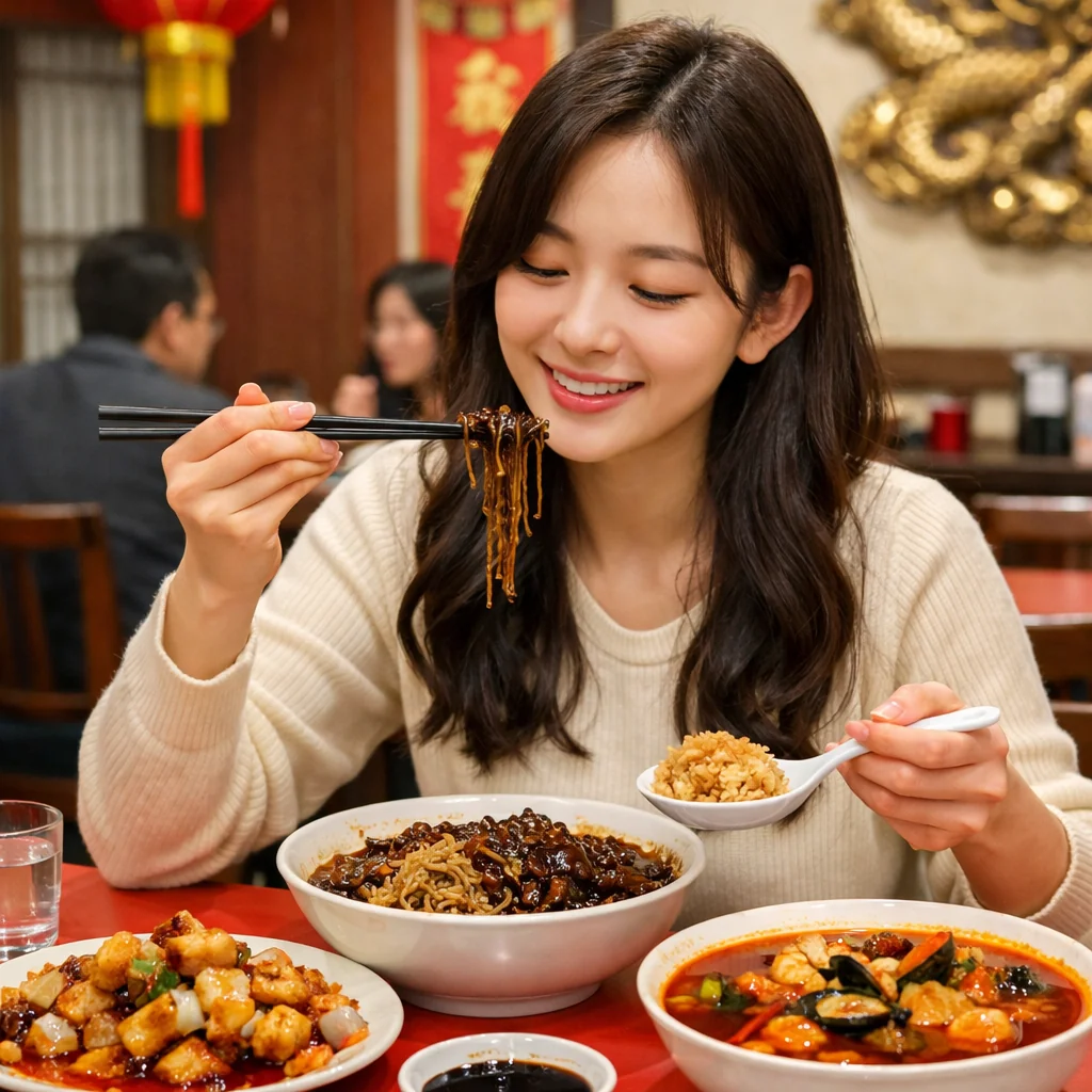 한국인 여자가 중국집에서 밥을 먹고 있는 모습