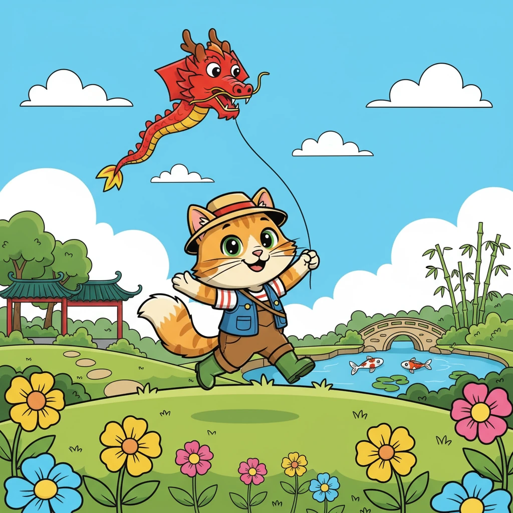 帮我生成一个关于小猫钓鱼的中英文绘本,一行英文,一行中文,方便大家学习英文和中文。