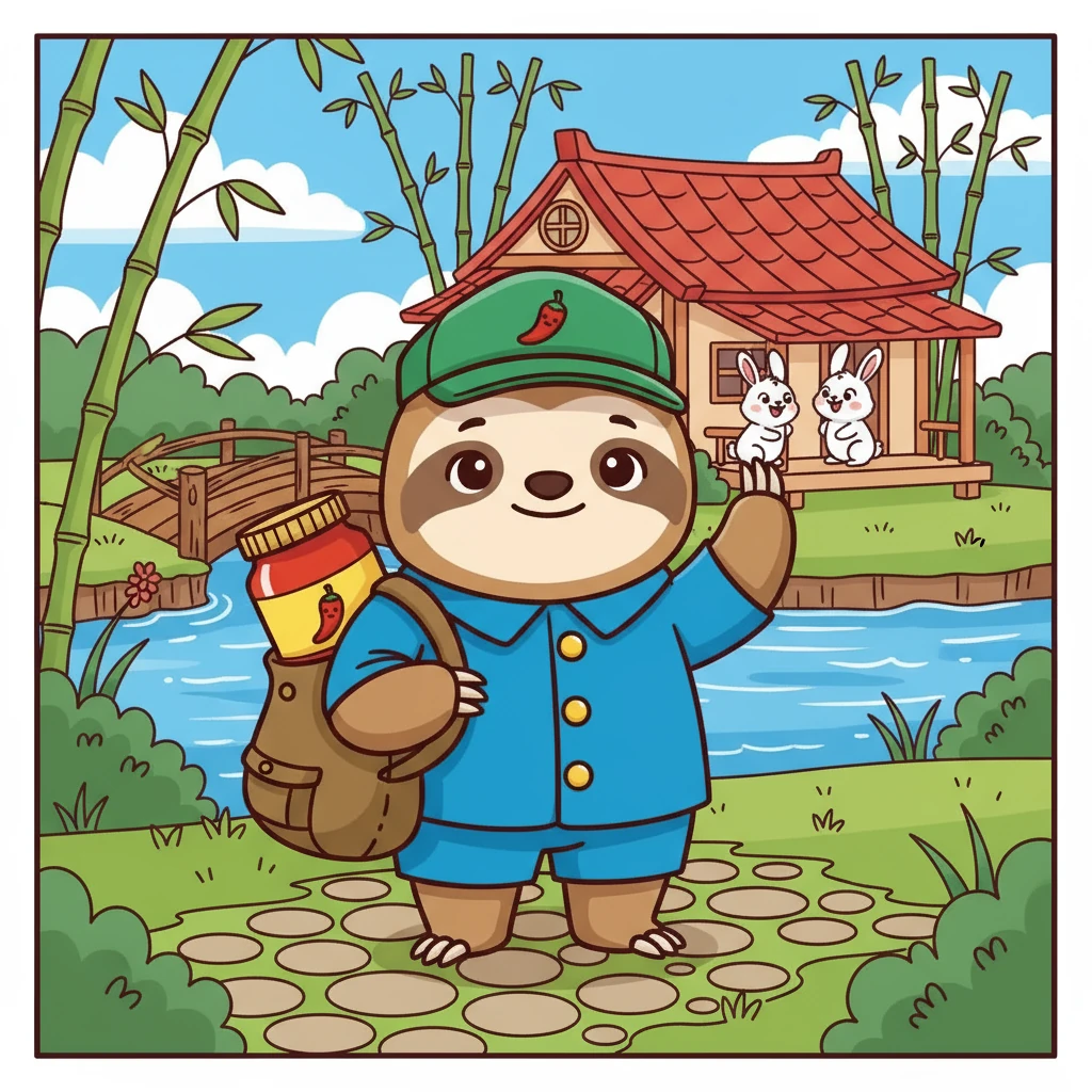 帮我写一个绘本故事,绘本文案语言简洁,适合7岁左右的小朋友阅读。故事梗概参考如下:树懒快递员接到一个任务“将一罐辣椒酱送到河对岸的兔子家”。树懒小心地用泡泡纸把辣酱打包成了一个巨大的球,然后以每小时一米的的速度朝河对岸"冲刺"。当他终于到达兔子家,兔子已经等得睡着了。他叫醒兔子递上包裹,兔子看着巨大的球陷入疑惑,树懒已经转身走了。