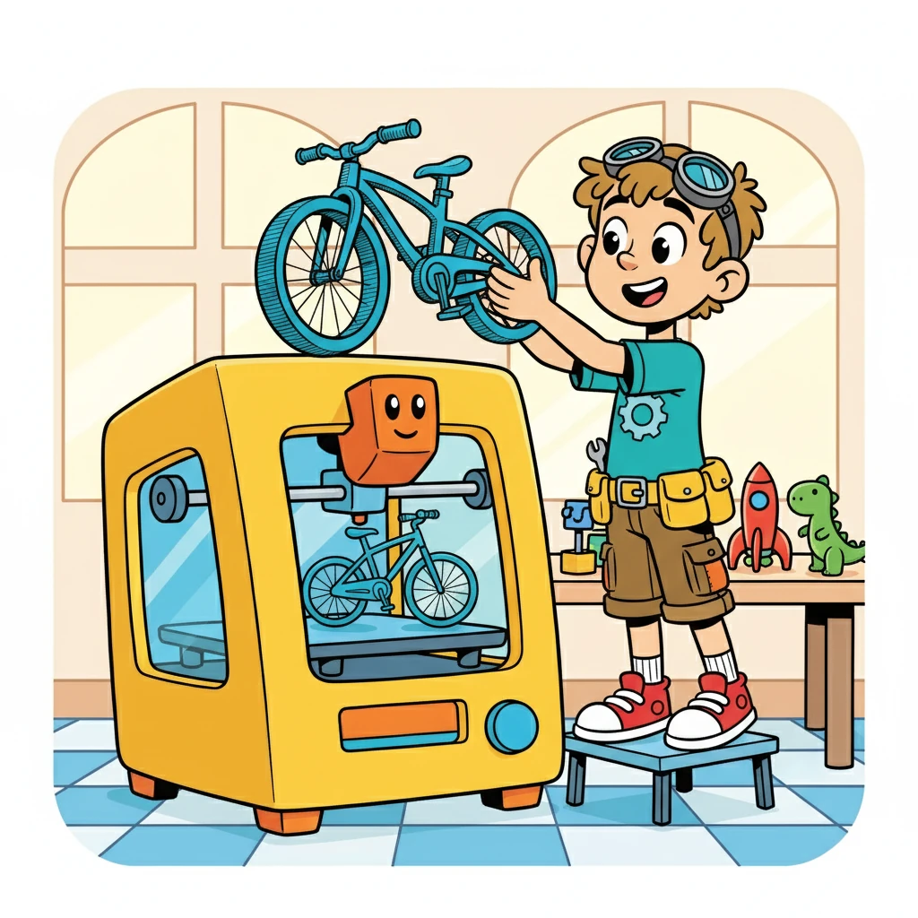 Create an illustrated nonfiction storybook for ages 8–12 about a breakthrough in 3D printing. Scientists have, for the first time, 3D-printed fully functional machines. Feature the first model: the ‘Airbike,’ a nylon bicycle as strong as steel but much lighter, printed in one piece with no assembly required. All text must be in English—titles, headings, body text, captions, speech bubbles, and glossary—written in clear, kid-friendly language. Tone: hopeful and inventive. Style: colorful diagrams, close-ups of the Airbike frame with labeled parts. Length: 12–16 pages with this page plan: 1–2: What is 3D printing? 3–4: What “fully functional machines” means 5–8: Airbike—nylon material, strength vs. weight 9–10: Printed in one piece—no assembly 11–12: Tests and real-world use 13–14: Future of transportation 15–16: Glossary & fun facts (in English). Do not include any author name, byline, illustrator credit, or acknowledgments anywhere in the book.”