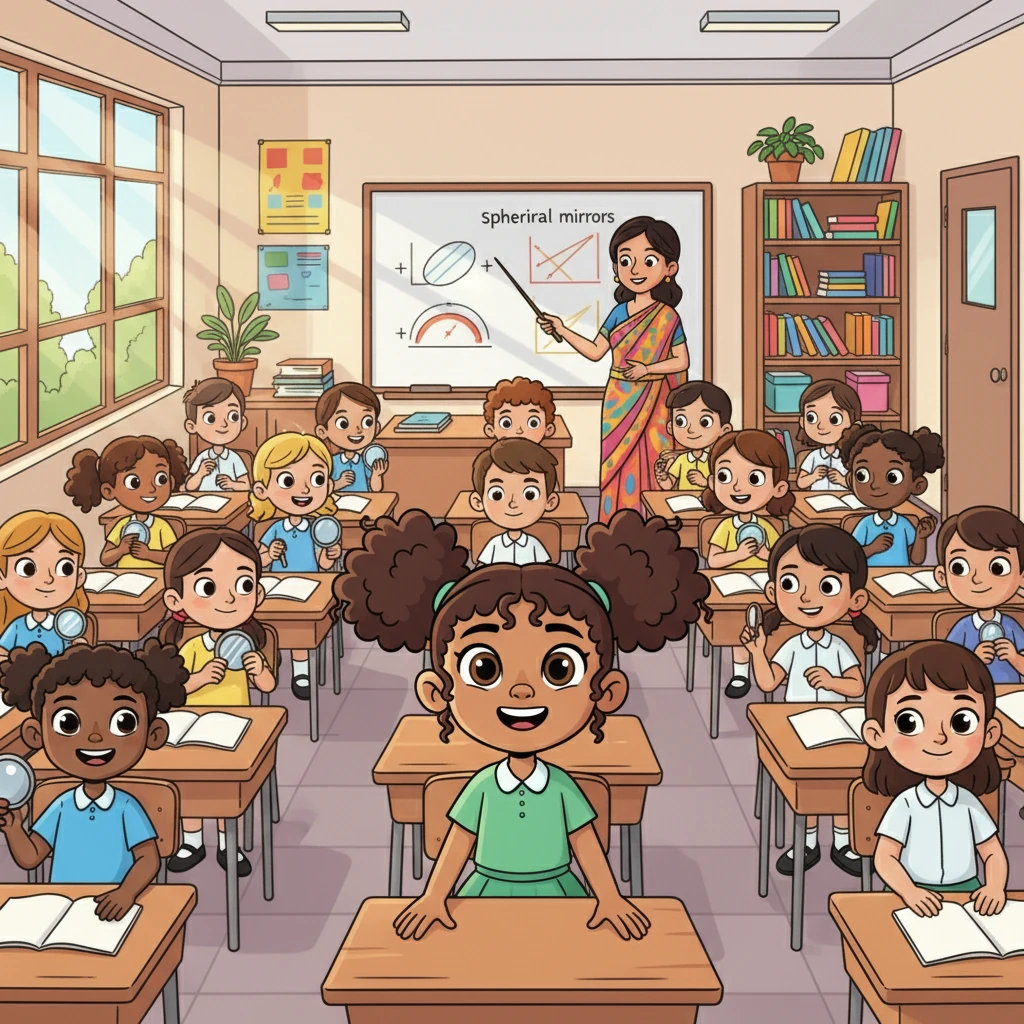 classroom of gr8 students 40 in number mixed class with boys and girls unifrom colour pista green girls having chequed shirt with seagreen anad red cheque lines and cream pants and boys having plain pista green Tshirt with chequed collar.Teacher is Indian lady in sari . she is teaching about spherical mirrors . shrtells themtheir structure and construction .Then she takes them tot he physics lab where they stuexperiment tosee how th eimage aries with object kept at differnt distances fro concave and convex mirrors, she discusses theri uses witht hte childremn.She then demonstrates and teaches them to prove the laws of reflection of lightt. she the n teaches about bifocal convesx and concave lense sand the ir image fromation qualitatitvely by discussing how image varies . aslo she concludes class with discussion on uses of the lenses