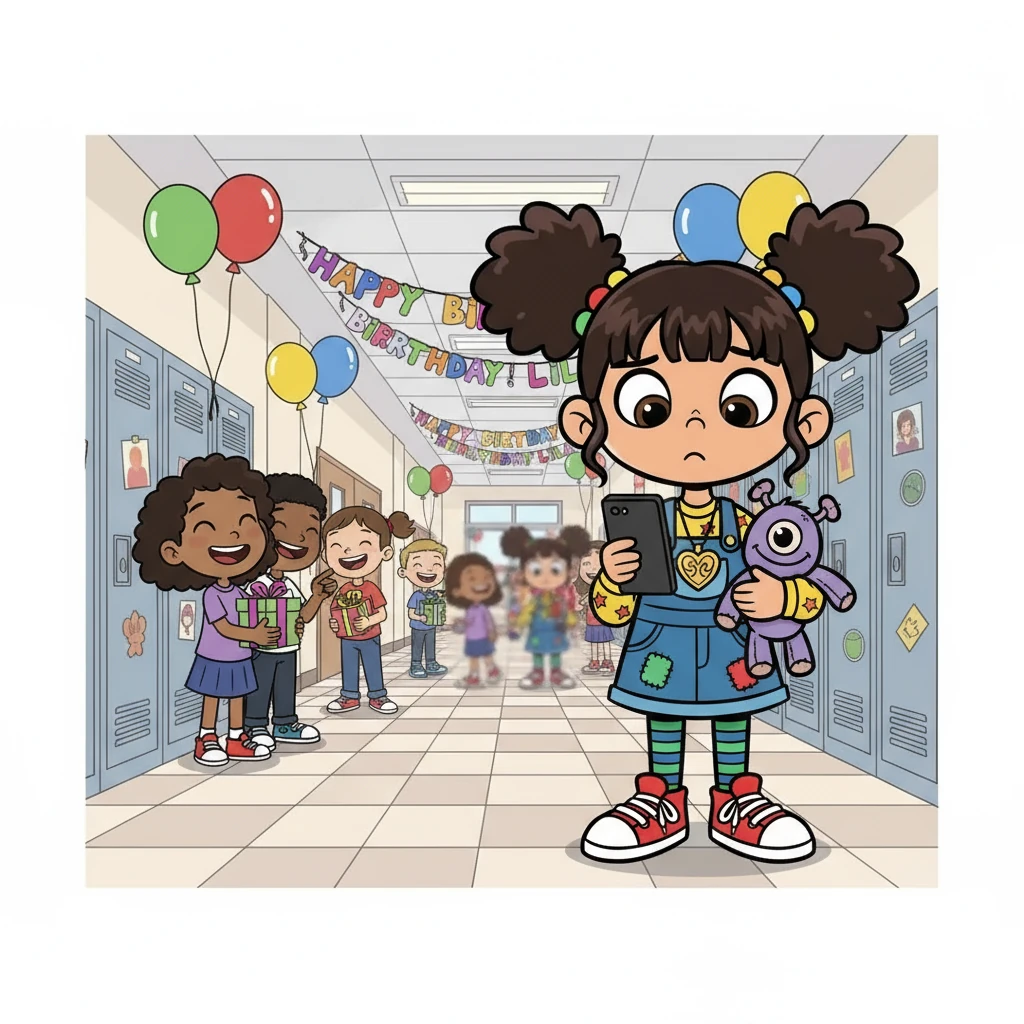 The hallway buzzed with laughter — the kind that bounces off lockers and fills the air like confetti. Posters of balloons and glittering letters announced “HAPPY BIRTHDAY, LILA!” everywhere. Everyone was talking about the party. Everyone — except Maya. She stood by her locker, pretending to scroll through her phone, though her screen was dark. Her name wasn’t on the guest list. It was like she’d been erased with a quiet stroke of a pencil. “She’s too dramatic,” someone had whispered the day before, words slicing the air like glass. Maya had smiled then, pretending not to hear. But now, the laughter around her felt like a storm pressing against her ribs. That night, she lay in bed, staring at the ceiling fan spinning like time itself — endless and uncaring. A memory flickered: last year’s party, when she and Lila danced barefoot in the rain, shrieking as thunder rolled. Maya had tripped, tearing her dress, but laughed until her stomach hurt. “You always turn disasters into stories,” Lila had said, smiling. Now, that memory felt like a photograph left in the sun — faded, burned at the edges. At school the next day, Maya found a pink envelope in her locker. For a heartbeat, her heart soared. Maybe it was a late invitation? But when she opened it, glitter spilled out — nothing else. Just glitter, tiny and cold, clinging to her skin like frost. Foreshadowing: The sparkle that once meant joy now shimmered like a warning — beauty that cuts when it’s hollow. Saturday arrived. The whole class buzzed online with pictures — flashing lights, pink frosting, smiling faces. Maya scrolled through them until her eyes blurred. Her chest felt like glass — transparent, fragile, and one word away from shattering. Outside, the sky darkened. She slipped on her shoes and wandered through the streets, the cold air brushing her cheeks like whispers. She passed Lila’s house. Music pulsed behind the windows, but she didn’t stop. Instead, she walked to the old playground — the one where she and Lila once made “wishes” by burying marbles in the sand. She knelt and dug through the dirt. Her fingers brushed something smooth. A blue marble, still there. She held it up to the streetlight, and the glass caught the glow — a tiny world swirling with colors. “Maybe not all things forgotten are gone,” she thought. She smiled — not the bright kind for photos, but the quiet kind that heals in pieces. Somewhere in the distance, fireworks burst from the party, lighting up the sky. But Maya didn’t flinch. Because she realized something that night — being left out of their world didn’t mean she had no world of her own.