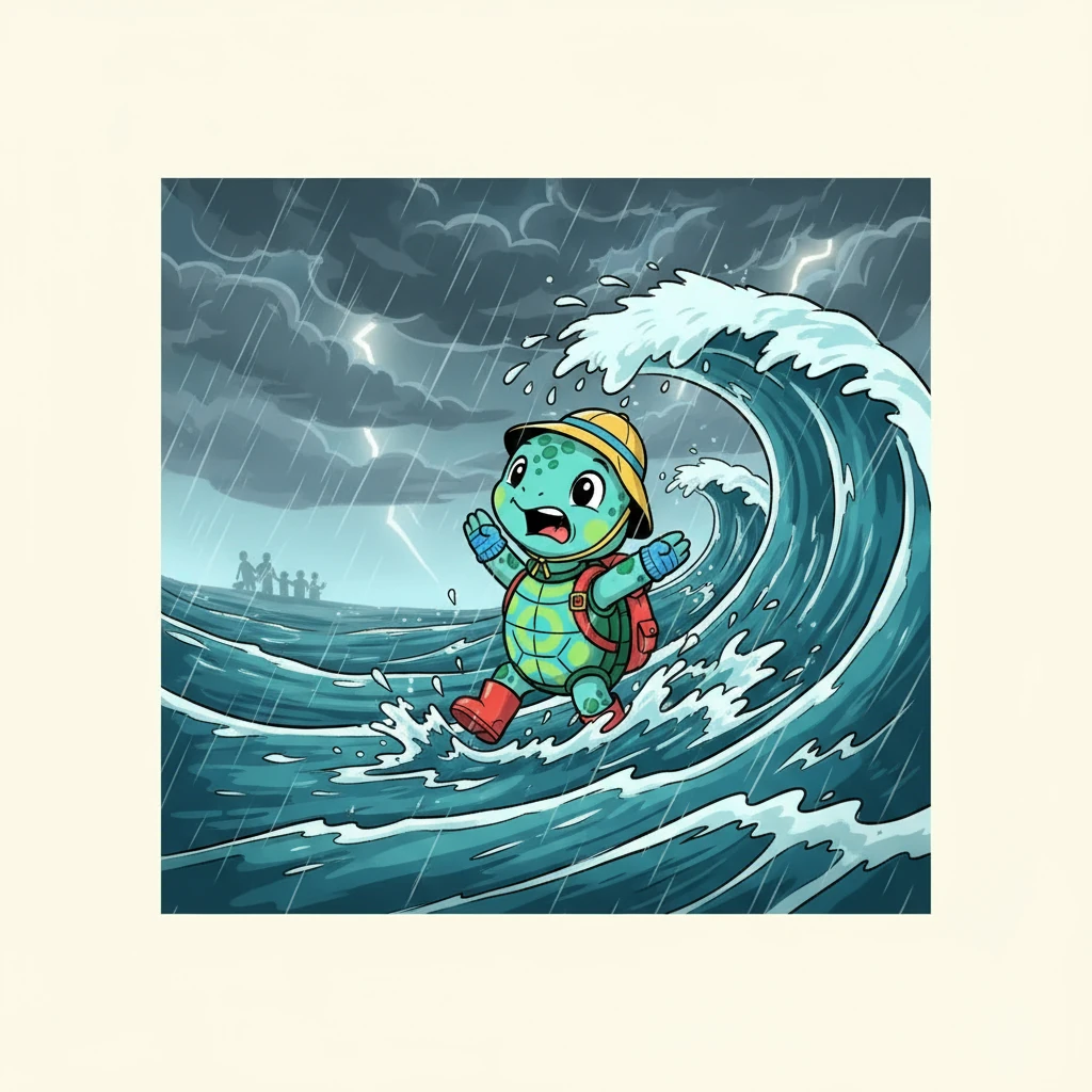 Write and illustrate a 24-page children’s picture book about a little turtle named Tuga who gets lost during a big storm and must find her way back home to her family by the sea. The story should include short, poetic text and gentle illustrations that express hope, courage, and the power of love. Each page should have 1–3 simple sentences, easy for children ages 4 to 8 to read or listen to. During her journey, Tuga meets: Pico, a curious fish who teaches her not to be afraid. Luna, a kind seagull who tells her to never give up. Cris, a funny crab who shows her how to move sideways when the waves are strong. The story should have a hopeful, emotional tone, ending with Tuga finding her family and realizing that love will always guide her home. Visual Style: watercolor illustrations with soft colors — turquoise, deep blue, light sand, and golden sunlight reflections. The style should feel peaceful, tender, and full of ocean light. Format details: 24 total pages (including cover, dedication, story, and educational message). Page 1: cover illustration Page 2: dedication — “For all the children finding their way back home.” Pages 3–22: the main story (10 story spreads, one per key moment) Page 23: educational message — “Caring for the ocean also means protecting the stories of those who live in it.” Page 24: “About the author” and thank-you note Author: Andrés Make the story tender, inspiring, and visually cohesive — perfect for a bedtime story or early reader picture book.